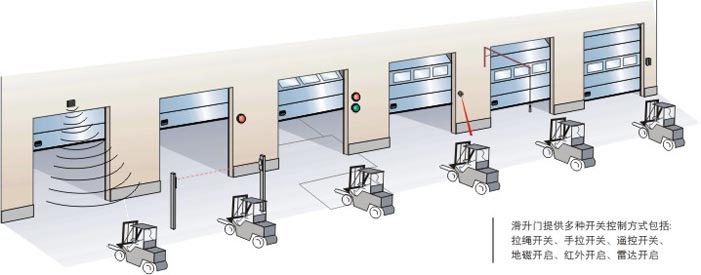 小型中型大型具有彈簧平衡系統(tǒng)的分節(jié)滑升門系列 每臺電機(jī)配備一根手動(dòng)鏈條。在停電的情況下,拉動(dòng)手動(dòng)鏈條能使門體開啟。每臺電機(jī)配備一個(gè)控制盒,三鍵開關(guān),按動(dòng)按鈕,也能開啟門體。